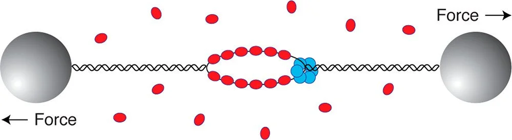 Schematic illustration of the single-molecule methodology that applies controlled forces on DNA and simultaneously allows real-time observation of DNA-templated processes.